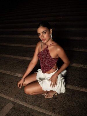 Esta pañoleta tejida es el accesorio perfecto para realzar cualquier look de verano, ya que su textura ligera permite llevarla cómodamente incluso en los días más cálidos. Su diseño triangular, con un estilo sutilmente calado añade un toque artesanal y romántico. Puede llevarse anudada al cuello, como bandana en el cabello o incluso como accesorio para el bolso. Su versatilidad la convierte en el complemento ideal para cualquier ocasión de verano. Ideal para complementar un look con nuestra MINI SUMMER SKIRT y nuestra PASTEL T SHIRT.